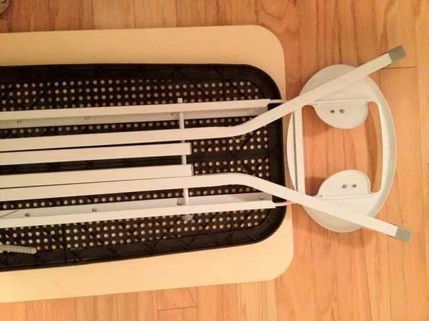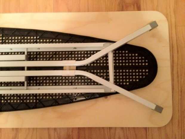 Tenga en cuenta la segunda foto incluida con este paso... no hay mucho espacio al final de la espalda (más amplio) de esta tabla de planchar por el soporte incorporado para el hierro. Así, la mayor parte de la longitud adicional de esta nueva cumbre tiene que colgar el extremo delantero (estrecho). Si la tabla de planchado carece del hierro titular, ajuste su parte superior para que cuelga de manera uniforme en el frente y la parte posterior.