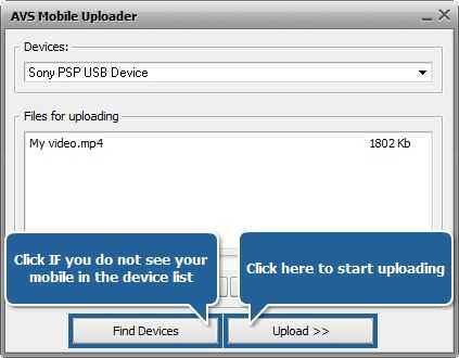 Si Sony PSP no aparece en la ventana de AVS Mobile Uploader debe presionar el botón Buscar dispositivos para buscarlo.