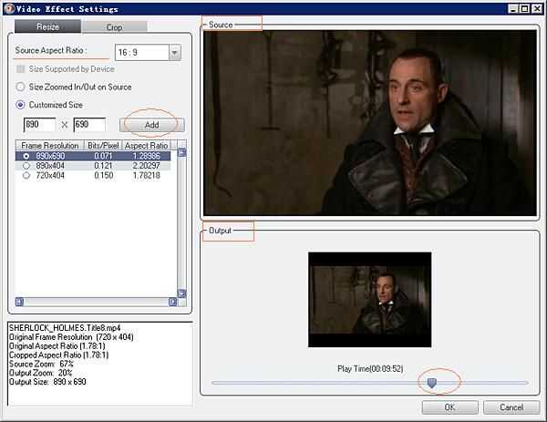 Aquí puede seleccionar el conveniente relación de aspecto, resolución marco y visualmente Verifique la salida de la escena diferente efecto por arrastra la barra deslizante en la parte inferior derecha, y los parámetros detallados de salida de la fuente de los archivos en la esquina inferior izquierda.