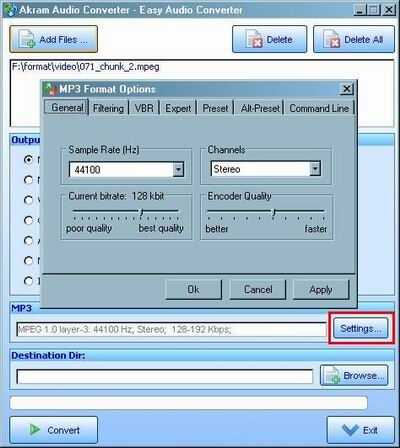 ¿Cómo convertir WAV, MP3, MP2, MP1, MPEG, MP4, AAC, OGG, AVI, MPC, MOV a WAV, MP3, MP2, ACM, AC3, MP4 con AKRAM Audio Converter? (5 / 7 paso)