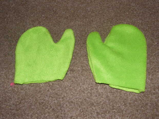 No puede ser un dinosaurio sin esos dinopaws. Hacer una plantilla para las manos en una posición de manopla. Cortar una 4 manopla formas de lana verde y coser su par, girando ambos adentro hacia fuera cuando se hace.