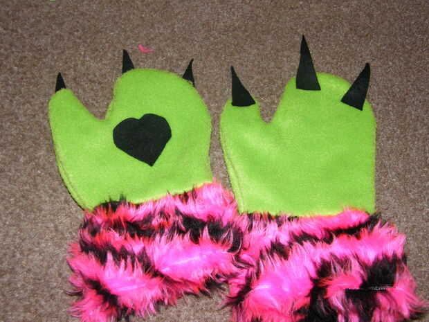 Corte algunas garras de fieltro negro y pegarlos en la parte superior de los guantes. Luego realizar un poco de fieltro para el lado de la palma. Si usted quiere poner un chillido de juguete debajo de los corazones y así cuando aplauda rechina. Pero no lo hice, soy lindo no estoy loco!!!!!!