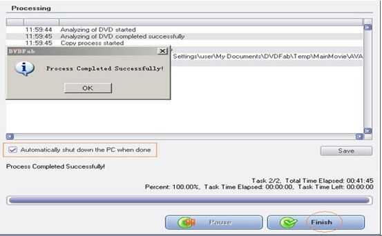 Después de algún tiempo usted obtendrá un mensaje de que el proceso ha finalizado con éxito, pulse el botón final, entonces usted debe ser capaz de reproducir el disco con Windows EX Power DVD 6.6 BD y su independiente reproductor Blu-ray. Nota: Si tienes eligió la opción "Apagar automáticamente el PC cuando se hace", nuestro programa cerraría automáticamente después de la quema.