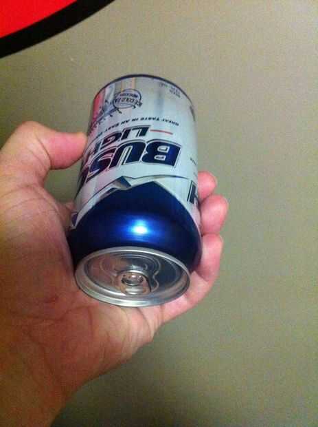 Poner la cerveza en la mano. Tener la ficha de empuje hacia usted y hacia abajo. También, inclinar un poco la cerveza para que la parte de la can frente a usted es hacia abajo. (Mirar la imagen de este paso por ejemplo). Tener la cerveza en este ángulo causará una burbuja de aire en la parte inferior de la lata (o el lado opuesto de la ficha de empuje). Con el pulgar presione la lata para asegurarse de que encontrará la burbuja. Toma la llave y empuje hacia abajo en ese punto. Añadir más presión hasta que la cerveza puede se pincha.
