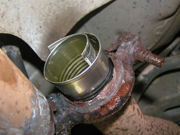 Usé las tijeras para convertir el poder en una chapa de acero, luego enrollada para ser lo suficientemente pequeño como para caber en el tubo de escape (tenga cuidado de filos, tanto en la corte puede y en los extremos rotos de los gases de escape - tétanos golpes heridos).