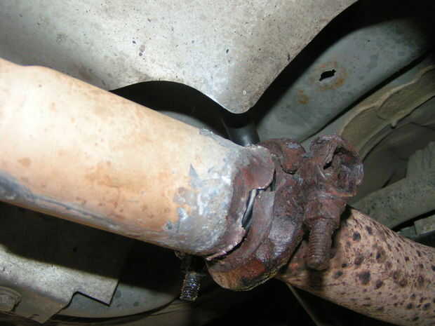 Entonces empujó la otra parte de los gases de escape en su lugar y se deslizó el laminado puede en esa sección también, barajando un poco a la vez sujetando el laminado puede con una llave de fontanero grandes.