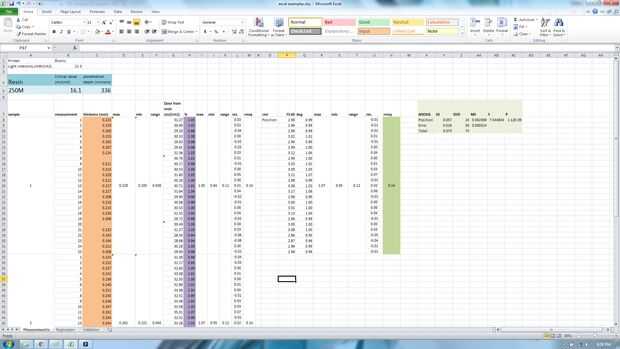 El siguiente paso es averiguar si es necesario realizar una corrección. En la hoja de excel en el tipo de ficha "Medidas" en todas las 75 medidas en las cajas de naranja. Luego añadir las correcta penetración y dosis profundidad valores críticos para la resina. No es demasiado importante el la dosis crítica es correcta, pero la profundidad de la penetración debe ser exacta. La hoja de cálculo hace un ANOVA análisis (células verdes) para determinar la importancia de la variación en la dosis en las diferentes posiciones de 25. Si el valor de p es entre 10 a 0,1 hay mucho ruido en las mediciones y la variación entre todas las mediciones es similar a la variación entre cada posición. El proyector ya es bastante uniforme, o la resina no es particularmente dosis sensibles o no se puede utilizar un micrómetro constantemente. Si el valor p es menor que 0,01, es definitivamente vale la pena continuar por el resto del Instructable es una cantidad estadísticamente significativa de la variación. Si es entre 0.1 y 0.01 su corte no tan claro.