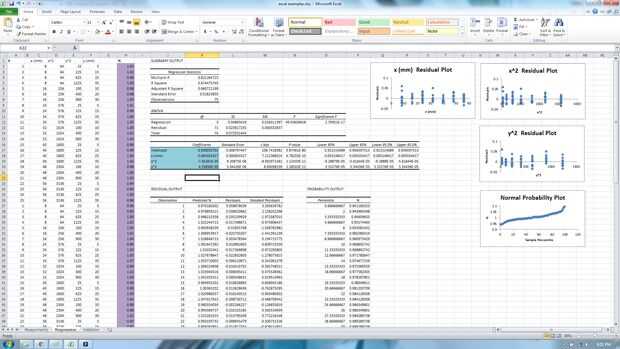 Excel tiene una herramienta bastante útil regresión lineal construida en. De las cajas de color púrpura en las "medidas" ficha copia y pega las dosis calculadas a pestaña de "Regresión". Yo jugaba con unos cuantos modelos diferentes. Los residuos de dejan muy claro que se necesitan condiciones de orden segundo. No estoy seguro si la forma de este modelo es general para la impresora de la brasa, así que vale jugando aquí un poco.