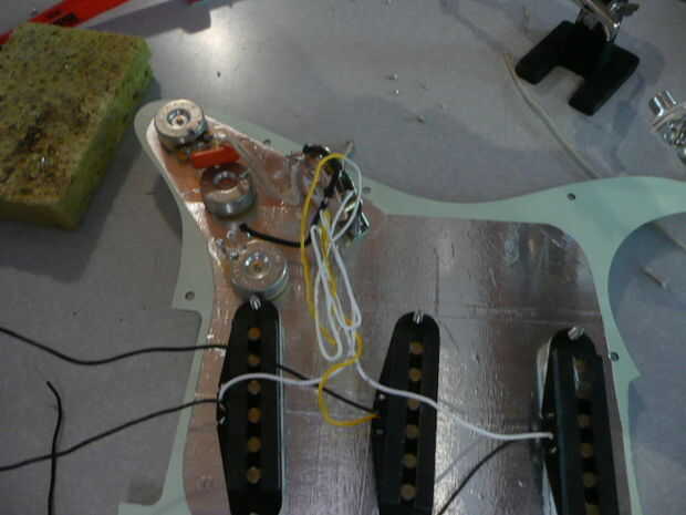 Lo primero que hice fue soldadura que toda la camioneta color cables a sus posiciones correctas en el interruptor. Puede soldar los componentes en cualquier orden que desee. Asegúrese de que todos los cables van a sus lugares correctos. Muchas veces el cable jack pasa por un pequeño agujero en el cuerpo, así que asegúrese que el conector se monta en su lugar correcto antes de soldar en el circuito.