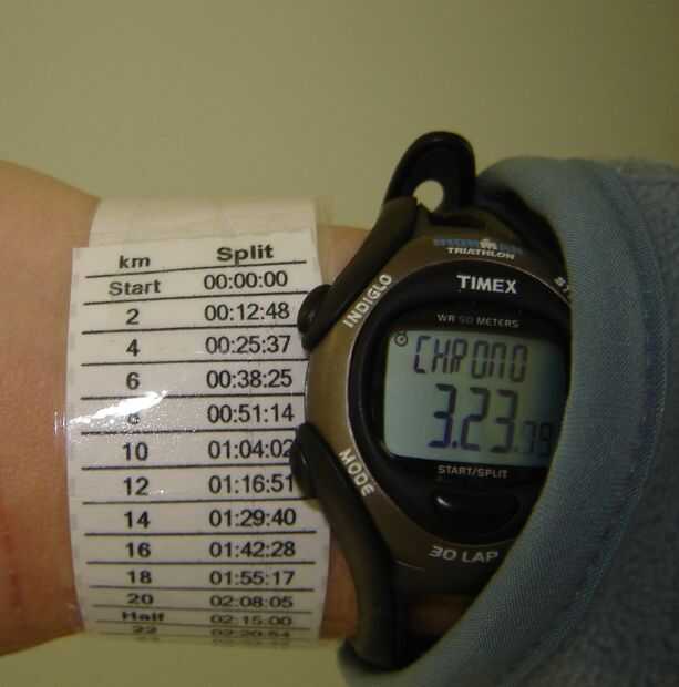 Introduce la distancia de carrera y tiempo de acabado deseado y mostrará los tiempos del partido. Imprimir, cortar, aplicar cinta adhesiva transparente en ambos lados, entonces llevar en la muñeca al lado de usted reloj.