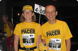 Encontrar un ritmo Grupo: Si ves a alguien corriendo con una señal de que tiene un tiempo en él, son un pacer. Se les paga para correr el maratón a un cierto ritmo. Si es posible, encontrar un corredor que va a un ritmo similar que e instalarse con ellos.