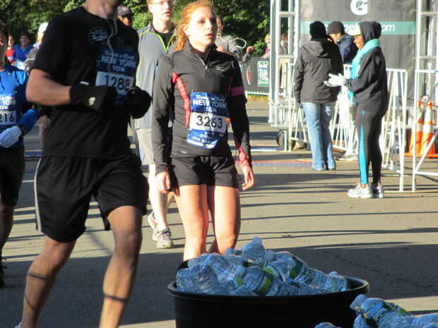Después de recibir su medalla acaba y recoger su bolso en el paquete de recoger, encontrar tus amigos y familiares y tomar más fotos.  ¡ Felicidades! Usted sólo corrió un maratón. Este es uno de los más grandes sentimientos y logros.  Compartir su celebración con sus compañeros de corrientes y los corredores a tu alrededor.  Asegúrese de que usted camina lentamente y llevar en alimentos y bebidas después de la carrera.  Mayoría de la gente a gastar en cualquier lugar entre 1200-2000 más calorías en una maratón según su peso.  Su recuperación comienza justo después de terminar. Tomar en calorías inmediatamente después de la carrera le ayudará a recuperarse más rápido.