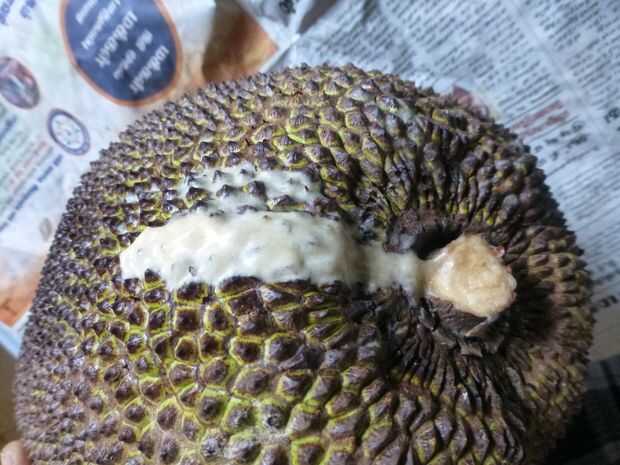 La fruta no está lista para cortar inmediatamente después de la cosecha. que tenga que permitir unos días más para que la fruta madure totalmente. Hacer un corte de luz cerca del punto donde la fruta fue unida al árbol de sap más se exuda hacia fuera de allí. Mantener la fruta en un periódico viejo o un saco para evitar que el suelo llegar desordenado con el sap.
