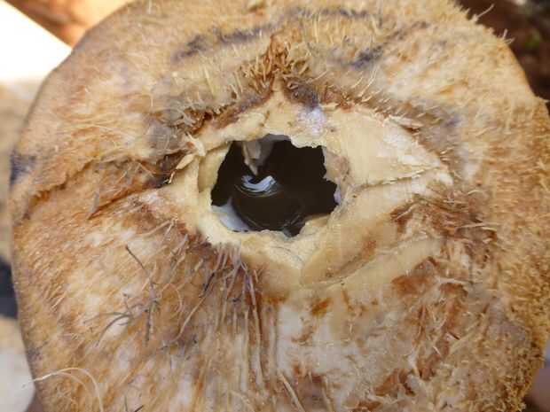 Golpee ligeramente sobre el caparazón un poco lejos del centro. Par de toques en un círculo hará una abertura en la cáscara. No derrames o residuos, el coco está listo para beber.