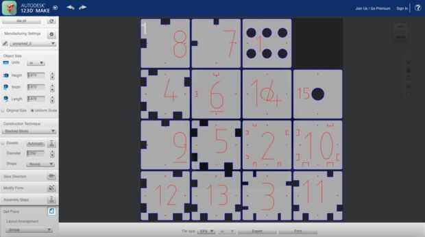 Ahora que tu fichero .stl es picada para arriba en el 123D Make seleccionar "Conseguir planes" en la parte inferior izquierda de la página de Make 123D con su archivo en él. Hacer que debe abrir una página con todas las diferentes piezas que muestran. En la parte inferior de la página habrá una pequeña barra que dice "Tipo de archivo." Seleccione DXF y luego haga clic en exportar. El archivo está ahora listo para corte laser.