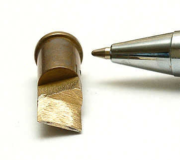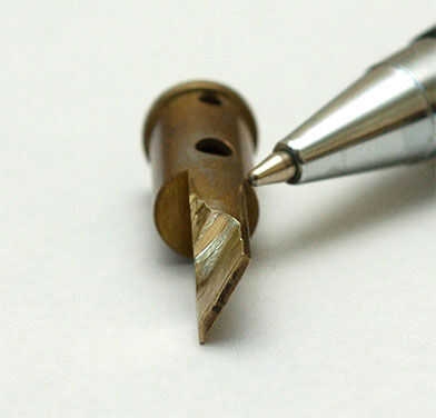 a ver la punta del cuchillo caliente puedes ver que es en forma de cuña. Esto no es todo lo que necesitamos. Mediante el uso de los útiles de amolar sin embargo podemos moler abajo la cuña como se muestra en la primera fotografía hasta que tengamos una hoja plana. Mantenemos el extremo puntiagudo de la cuña ya que es útil al hacer las primeras inserciones en el plástico.