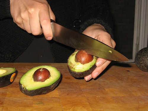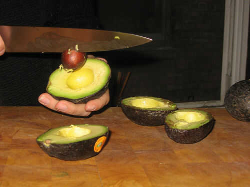 Torcer el cuchillo y el aguacate en diferentes direcciones. El hoyo debe permanecer unido a cuchillo y afloje de la fruta. Como tirar el cuchillo lejos, el hoyo debe venir con.