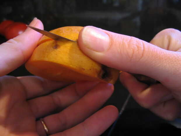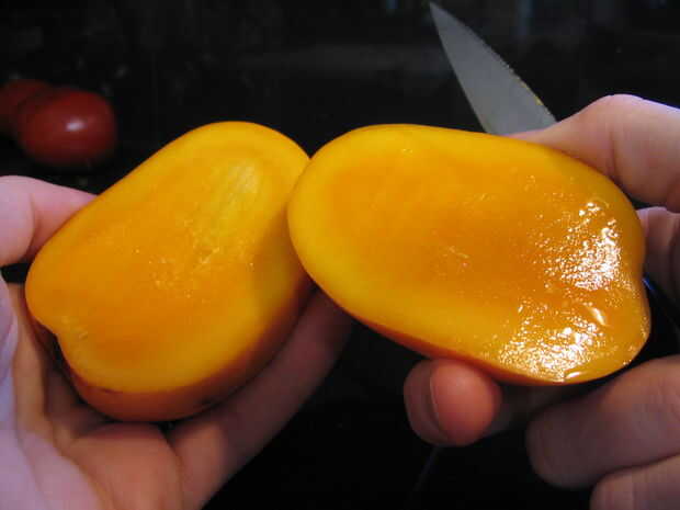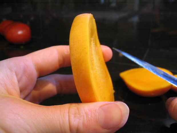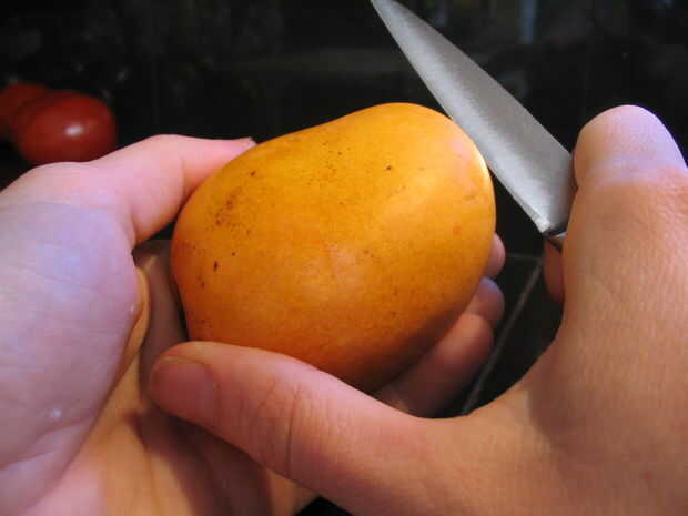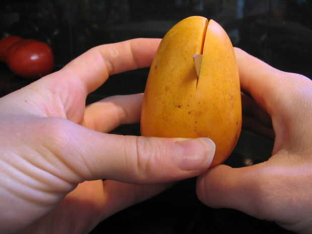 Usando un cuchillo de pelado, iniciar justo al lado de la línea central y corte paralelo a la semilla a lo largo del eje de la fruta. Si en contacto con la semilla, sólo de la curva, un poco para seguir los contornos de la fosa. Lo dejo más carne en el pozo, pero no va en cualquier lugar. Una vez que una sensación para los tamaños de semilla en sus mangos de elección, este proceso obtendrá incluso más ordenado. Debería ver el hoyo blanco que muestra en el pedazo de centro cuando haya terminado.