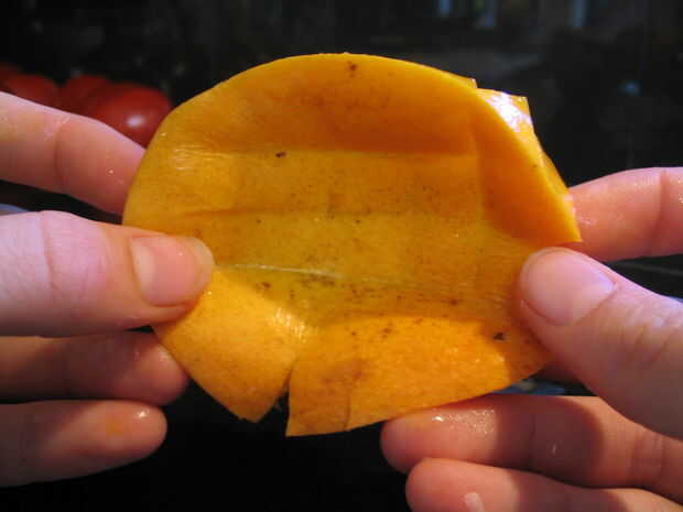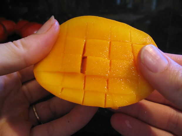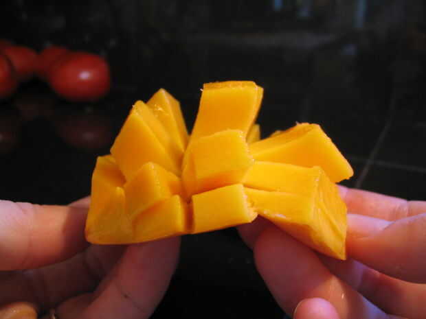 Tenga en cuenta que si has hecho menos de dos cortes en cualquier dirección, el mango no tiene suficiente flexibilidad para invertir bien. Más recortes, más fácil moverá de un tirón y mejor se verá. Aquí me he ido para un planteamiento de centro; a veces me gusta tener un montón de pinchos mango pequeño.