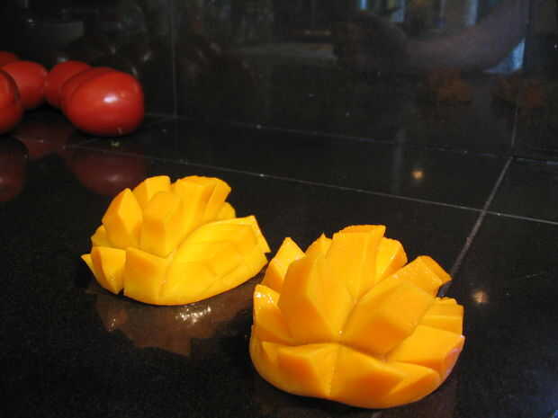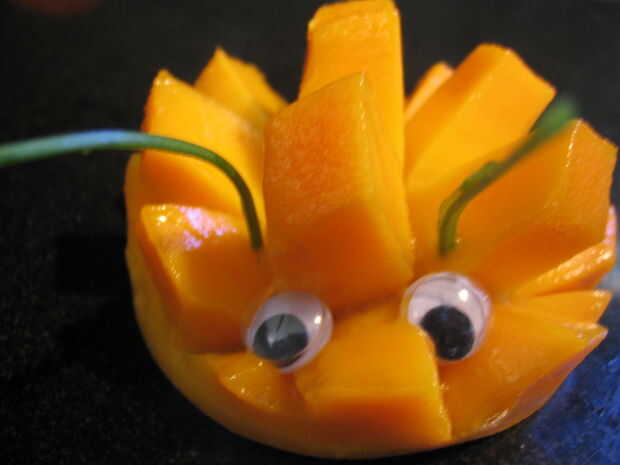 Colocar todos tus rebanadas de mango invertido sobre un plato de lujo y servicio. Decorar como mejor parezca. Mientras que los niños pequeños como las versiones decoradas, no se puede confiables para recordar que los ojos de googley estándar no son comestibles. Busque