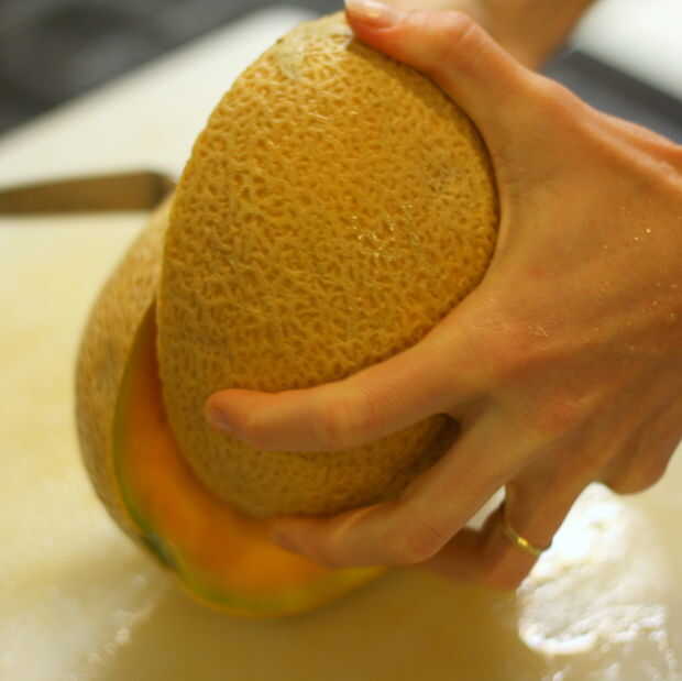 Asegúrese de lavar su melón bien antes de cortar, para no llevar las bacterias superficiales en la carne de melón comestible. (Gracias a thematthatter por el aviso!)