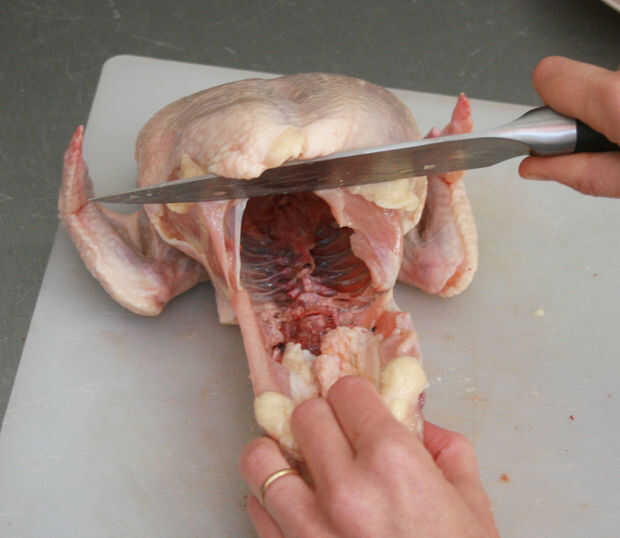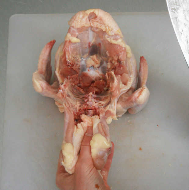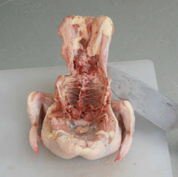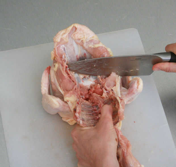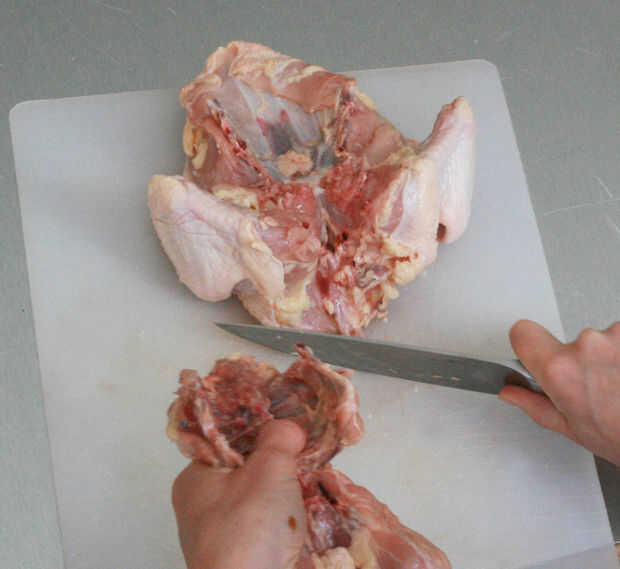 Continuar el corte para eliminar la totalidad de la columna vertebral.  Esto es una gran pieza para ahorrar para hacer el caldo de pollo!