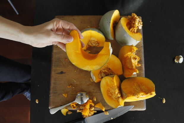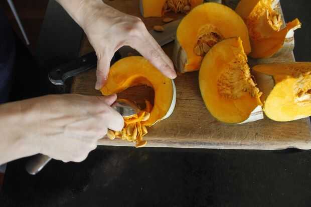 Limpiar la pulpa de la semilla de las rebanadas de calabaza dejando la piel en.