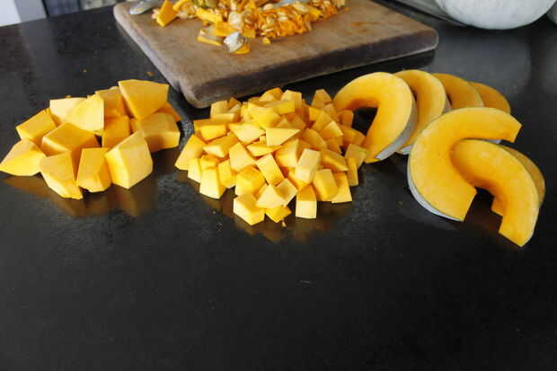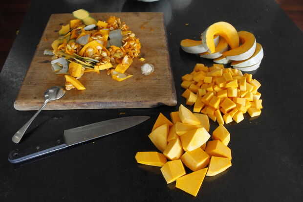 Mi favorito calabaza - la calabaza puede ser difícil de cortar. Es suave pero dura consistencia requiere una buena técnica.Yo he perfeccionado mi método para picar esta calabaza con tan poco alboroto y desechos como sea posible.Paso 1: Cortar en secc