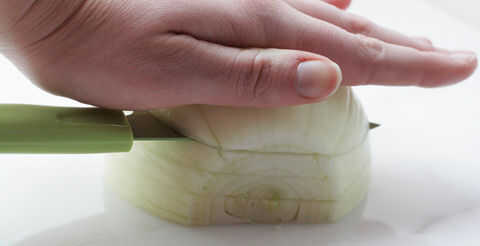 3. Tome una mitad de cebolla y lugar parte cortada hacia abajo. Presione la parte superior de su palma izquierda (o derecha Palma si usted dejó entregados) la cebolla y cortar lentamente la cebolla partida en el extremo opuesto de la raíz. Hacer cortes paralelos a la tabla de cortar aproximadamente 1 centímetro de distancia. No corte completamente a través de la raíz.