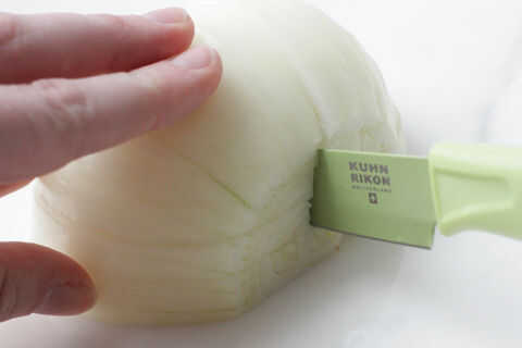 4. con la misma cebolla, colocar los dedos en el extremo de la raíz para sujetar la cebolla todavía. Lentamente hacer cortes perpendiculares para el tablero de corte de aproximadamente un centímetro aparte. Debe tener unos 4 a 5 cortes. Asegúrese de no cortar hasta el final con la raíz.