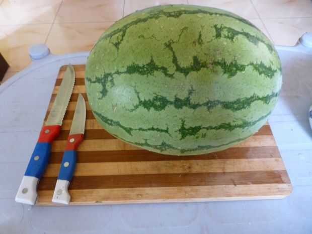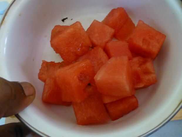 Lo que necesita es una tabla de cortar, un cuchillo, un recipiente para almacenar las piezas y por supuesto una sandía.