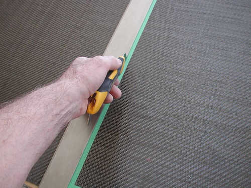 Utilizando una regla larga y una navaja muy filosa. Corte a lo largo de la cinta. Asegúrese de que cortar completamente a través de la cinta y el paño.