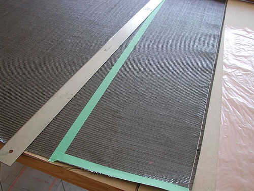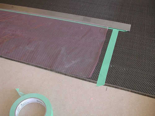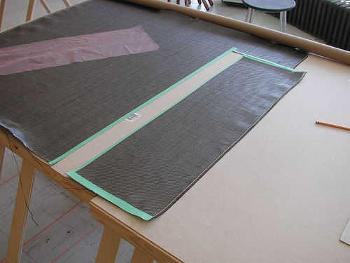 Aplique cinta adhesiva en las áreas donde usted quiere cortar el carbón. La tela en la foto de abajo ha cosido kevlar en el borde exterior. No necesitas cinta sobre esto. Asegúrese de que su pieza cortada de la tela es más grande por un par de pulgadas que el largo y ancho de la forma de cubiertas que desea plastificar.