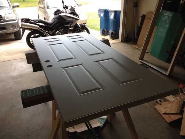 Coloque la puerta sobre los caballetes. Puede usar toallas o aislamiento de la pipa, trozos de alfombra, etc. sobre los caballetes para evitar arañazos. Esta puerta fue preparada, pero necesita ser pintado, por lo que acababa de usar alguna cartulina sobre los caballetes. Si su puerta es Pre-finished, tenga mucho cuidado para evitar rasguños.