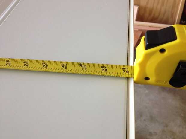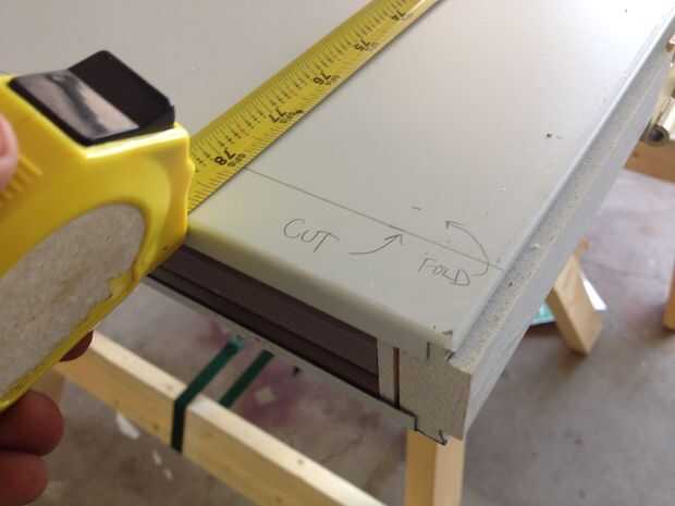 Ahora para marcar dónde cortar. A hacer dos marcas en cada lado. Medir desde la parte superior, marcar cuánto tiempo desea que la longitud final que. Minada necesarios a ser 77-5/8" por lo que esta había marcado como mi línea de"Doblez". Entonces medí otro 1/4"-3/8" más allá de la línea de doblez para mi línea de "Corte" dejar algún material que se puede doblar bajo más adelante. Esta longitud extra puede variar de marca de una puerta a la siguiente.