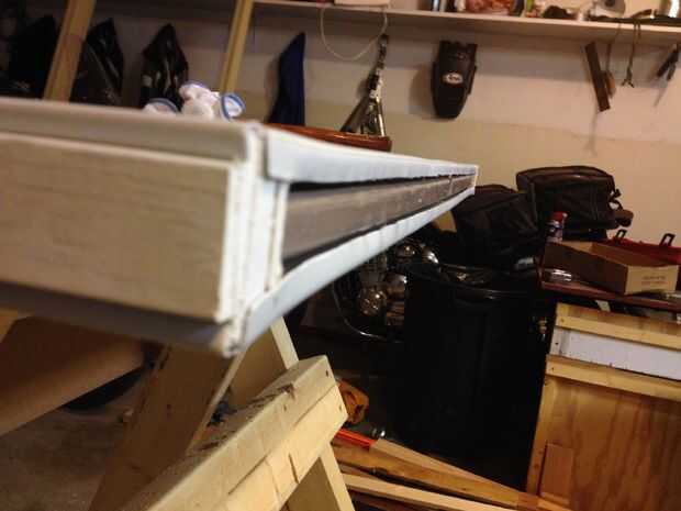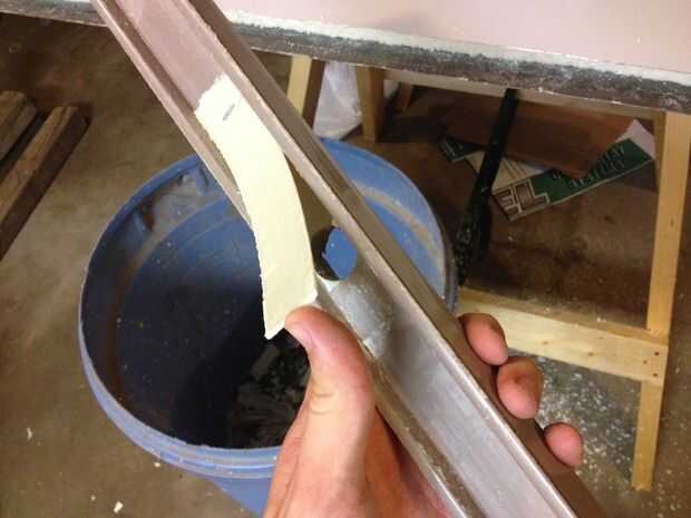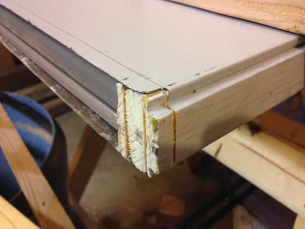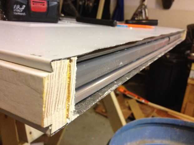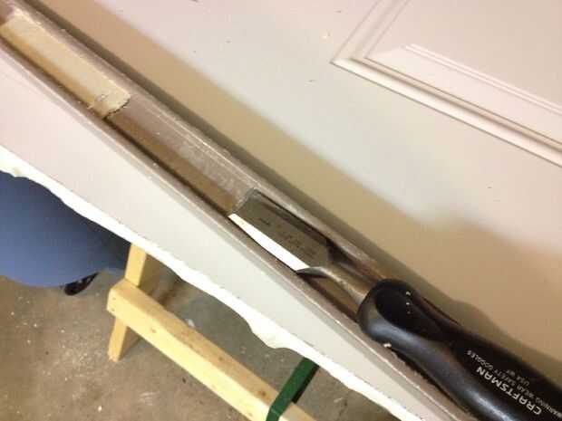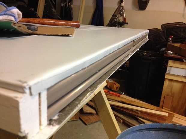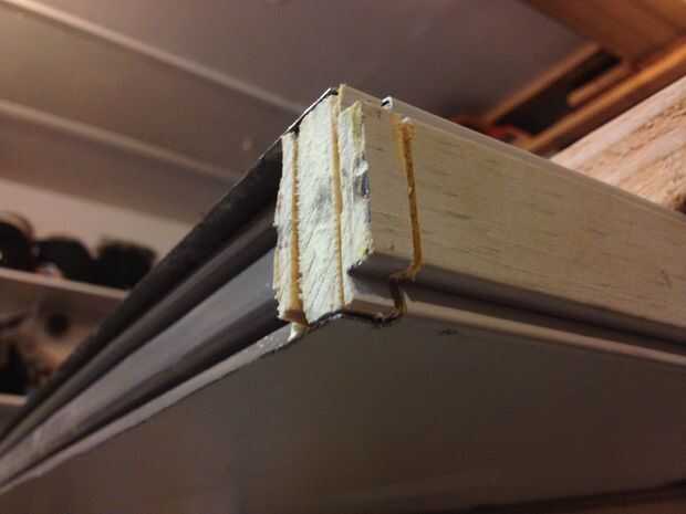 Con ambos lados del corte puerta, necesitará limpiar el riel inferior para reutilizar. Encontré que un cincel 1" encajan perfectamente para limpiar hacia fuera la espuma de la baranda inferior. Esta puerta se inyecta con una espuma de poliuretano después del montaje a través de un agujero en el riel inferior. Es delgada tira de plástico que actúa como una válvula unidireccional para evitar que la espuma saliendo hacia atrás.