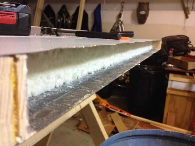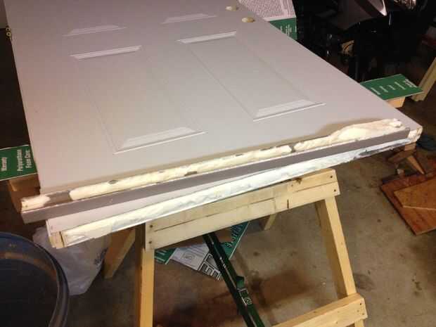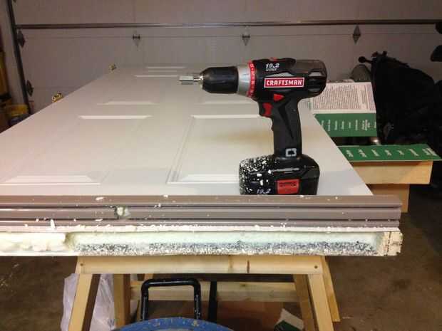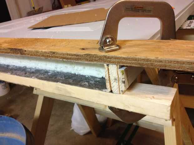 El siguiente es quitar parte de la espuma para hacer espacio para el riel inferior. Sólo desea quitar espuma a la profundidad adecuada para que el riel inferior estará en la línea de doblez. La forma más sencilla de lograr esto es con un router de mano por lo que se puede establecer la profundidad y ser la misma a través de todo el camino. Decidí usar una broca recta en un taladro y hacerlo a mano, comprobando constantemente la profundidad de mi corte (foto 6). Si hago otra puerta en el futuro, usaré un router.
