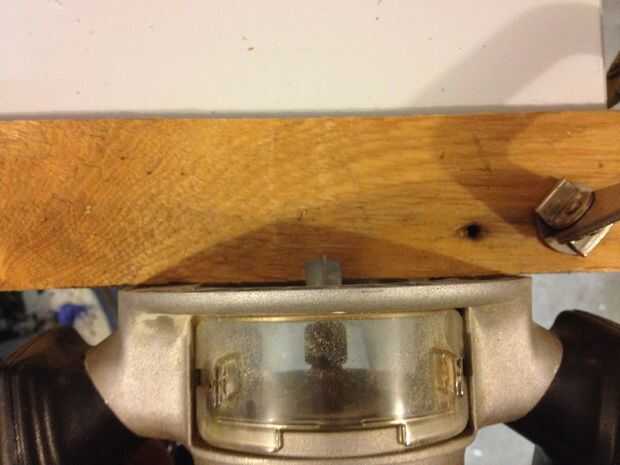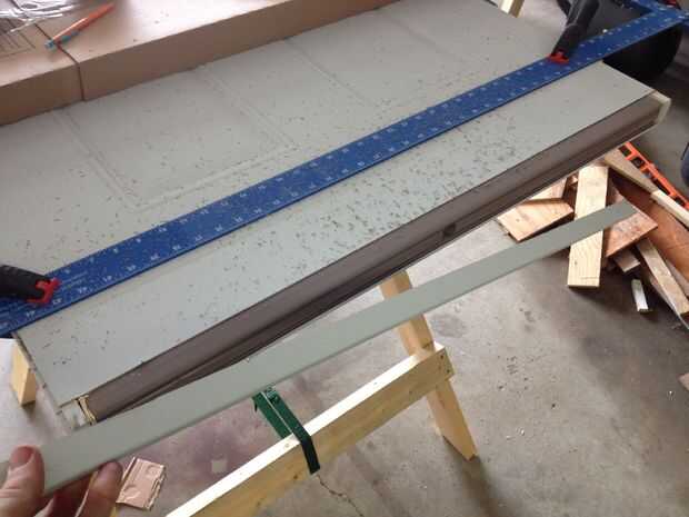 Para recortar los rieles laterales de madera, he usado un router, pero porque la superficie que apoyaría el router en este momento es simplemente dos bordes de acero, necesitaba darle una mejor superficie de apoyo. Sujeta algunos restos de madera a cada lado de la puerta para dar el router una superficie más grande para montar en la (foto 12). Configurar la profundidad de la fresadora para cortar de modo que los carriles laterales de madera al ras con el borde inferior del travesaño una vez instalado. En mi caso se trataba de 3/8". Corte los rieles de madera y sellar con alguna pintura (Foto 14 y 15).