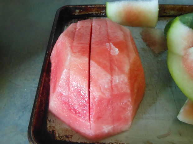 paso 1. Cortar ambos extremos de la sandía.Paso 1: Corte longitudinal Ahora hacer cortes a lo largo de 3-4" profundo y 4" aparte.Paso 2: Romper a lo largo de la línea de la semilla Paso 3. Ahora golpea el melón a lo largo de una tira cortada a r