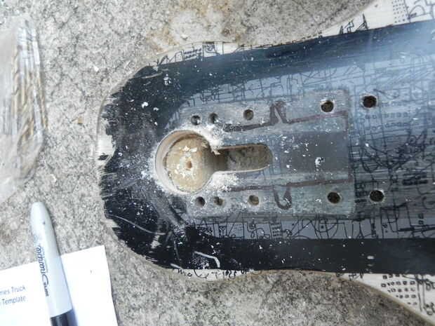 Utilice el agujero Sierra broca para taladrar un orificio que es tan amplio como la plantilla hacia la nariz del tablero. (El agujero largo estirado ya estaba allí en mi deck)