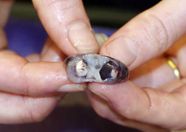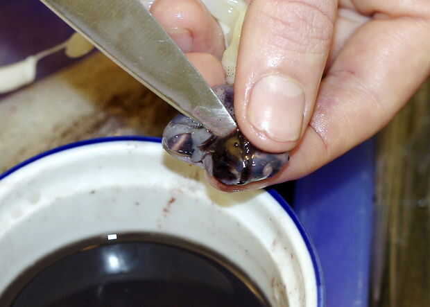 Apriete detrás de la cabeza sacar el pico, y quitar del centro de los tentáculos. Ahora corte los tentáculos por debajo de los ojos, teniendo cuidado de no para pinchar los ojos. Desde el extremo cortado se puede ver depósitos de tinta-son los pedacitos oscuros detrás de la parte trasera plateada de retina del calamar. Meter el cuchillo en la tinta y apretar suavemente las gotas adicionales en el recipiente.