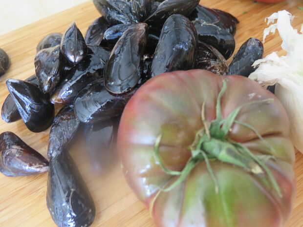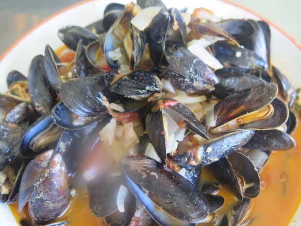 Una receta rápida, clásico para cocer al vapor los mejillones es picar ajo (finamente), cebolla y tomate (aproximadamente). Acitronar en la mantequilla junto con ramas de tomillo fresco, sal y pimienta al gusto. Una vez que están salteados, agregar ya sea 1/2 taza de vino blanco o cerveza o sidra de manzana duro podría funcionar. Para este lote, agregué una 1/2 taza de El Castor. Es aguardiente de cacto de pera espinosa y añade profundidad a la salsa. Coloque la tapa sobre la olla y dejar los mejillones al vapor durante unos 15 minutos. Cuando todos han abierto, están listas. Tener una baguette para mojar en la salsa.