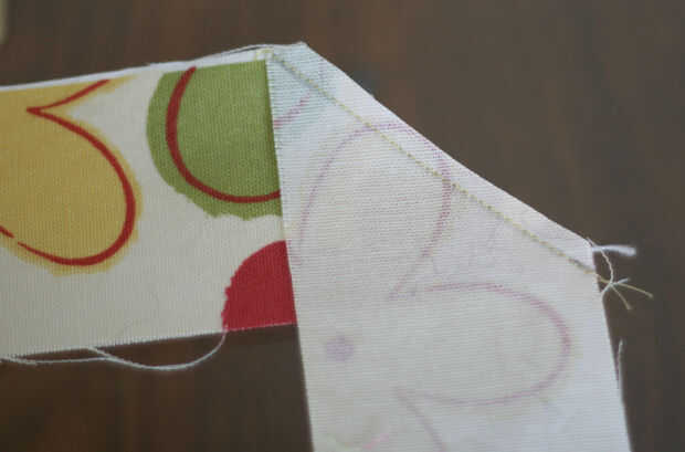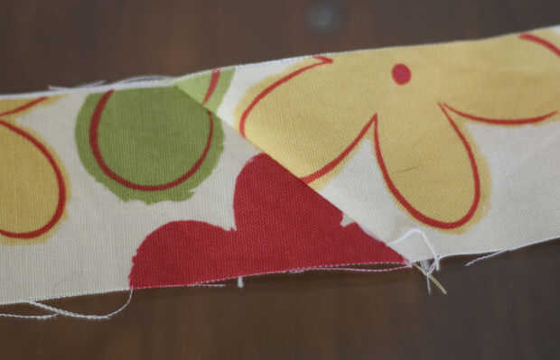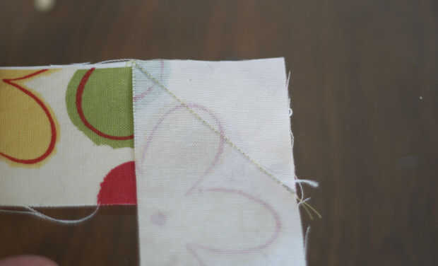 Tomar dos tiras y unir por imposición ángulos rectos, lados del derecho juntos. Dibujar una pequeña línea de esquina a esquina y coser a lo largo de esa línea. Cortar el triángulo a la derecha dejando un margen de costura de 1/4". Ir a la plancha y plancharlos abiertos. Ahora debe tener una tira de largo unida por una costura que va a través en un ángulo de 45 grados. ¿Por qué hacerlo así? Aún no confías en mí, ¿te? La razón de que hacerlo así es realmente, así que la tensión en la costura es repartida a lo largo de la cinta y no concentrada en un solo lugar. Una vez que se ha doblado y cosido abajo, no va en cualquier lugar. Mantener a unirse a tus franjas de esta manera hasta llegar a la longitud correcta.