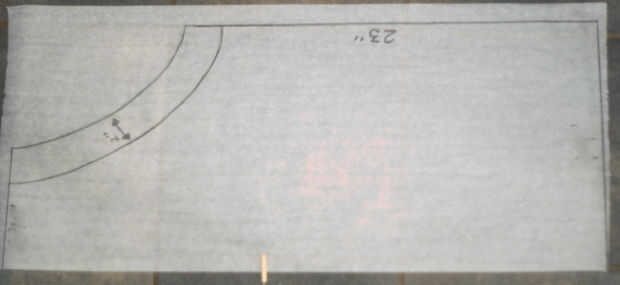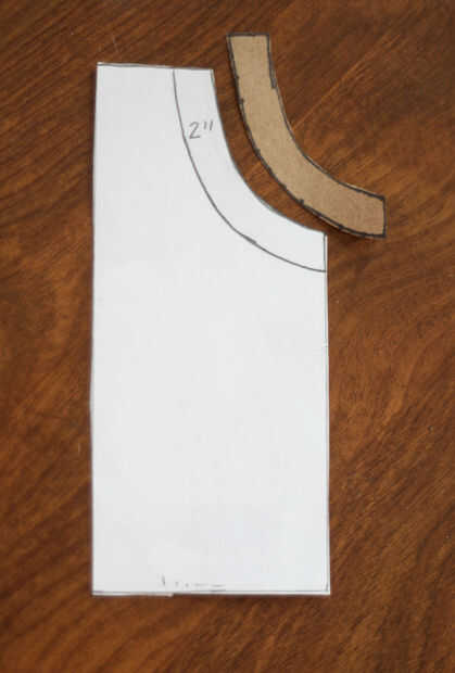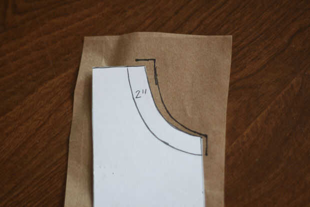 Vas acabar con dos piezas del patrón--uno se pondrá el delantal, uno para la carcasa. Comience con el delantal. Mida las dimensiones en el papel y dibuje una curva agradable para la sisa.