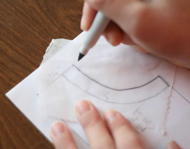 Nota: Si usted realmente no tiene una sola hoja de papel se puede ver a través, usando papel de embalaje u otro papel que no puede ver a través, deslice la segunda pieza bajo el patrón del delantal, traza el patrón del delantal, y la medida de dos pulgadas en el patrón de la cubierta la pieza. Asegúrese de que usted corte a lo largo del borde exterior del patrón delantal.