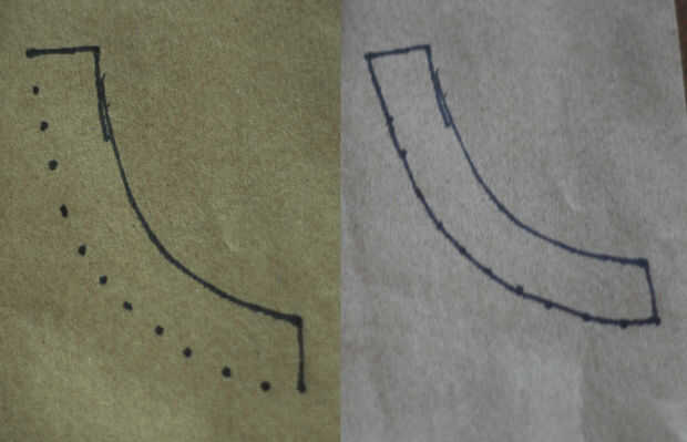 Ahora usted necesita hacer el patrón para la carcasa. Medir en dos pulgadas de la curva del brazo y marcar con puntos de varios lugares a lo largo del camino. Conectar los puntos por lo que ya tienes un constante dos pulgadas a todo lo largo de la curva. Esta es la forma de la pieza de la carcasa que va a necesitar para que el empate se deslice a través. Si usas papel de pergamino u otro papel transparente para su patrón, coloque otra hoja sobre su patrón y trace la forma curvada boomerang. Usted puede cinta adhesiva a una gran ventana o una puerta corredera durante el día para hacer más visibles las líneas.