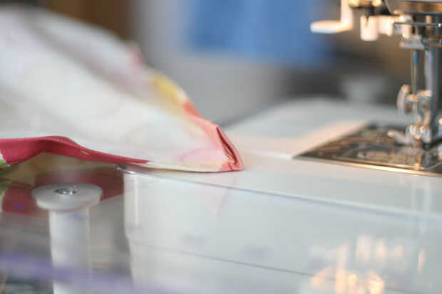 Pliegue el dobladillo como hicimos los lados y con un pliegue doble para ocultar el borde. Recorte las esquinas si es necesario. PIN y coser. Casi hemos terminado!