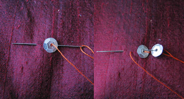 Lleve la aguja a través del centro de una de lentejuelas. Volver hacia abajo en el tejido justo al lado de las lentejuelas, trayendo a una corta distancia en el otro lado. Desea la aguja a salir donde estará el centro de la próxima lentejuelas, así que evaluar esa distancia según el tamaño de sus lentejuelas.