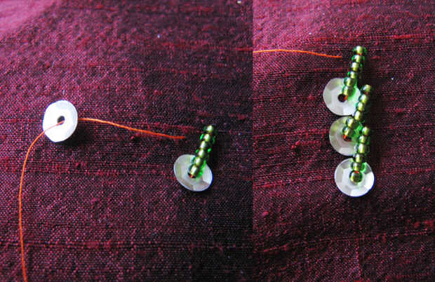 Suba la aguja a través del tejido y del hilo de rosca una de lentejuelas, luego granos de la semilla (el número de granos depende del tamaño de sus lentejuelas). Volver hacia abajo a través de la tela una distancia corta diagonalmente a lo largo de la línea que estás exponiendo.