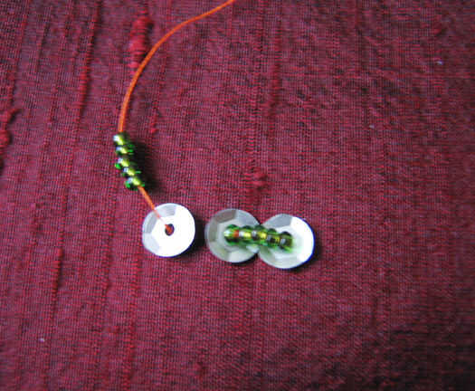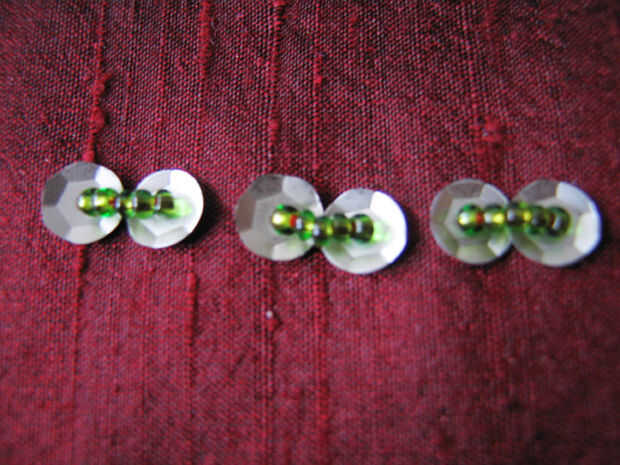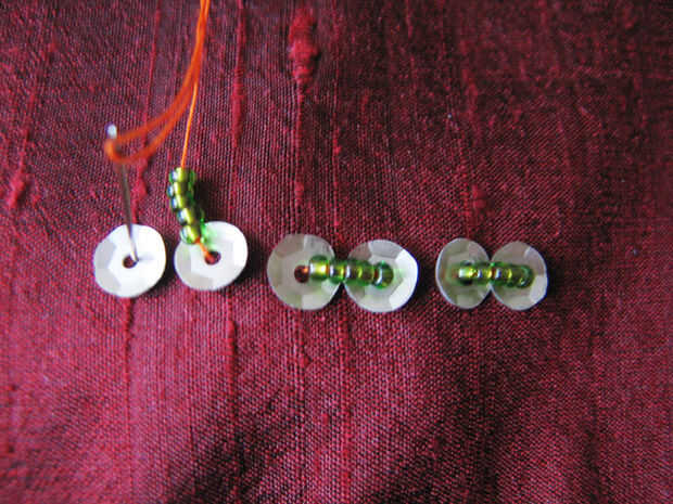 Subir la aguja e hilo de lentejuelas, luego algunos granos de la semilla (como antes, el número depende del tamaño de sus lentejuelas). Otro cequi del hilo de rosca (Asegúrese de que están enfrentando la manera correcta, si está abombadas lentejuelas) e ir hacia abajo a través de la tela.